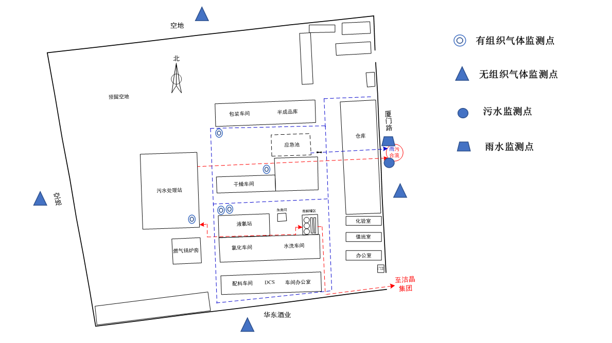 污水總排口一個,位于廠區(qū)東側外墻外,大氣排放口共5個,其中污水處理1個,氯化2個,干燥1個,包裝1個 |