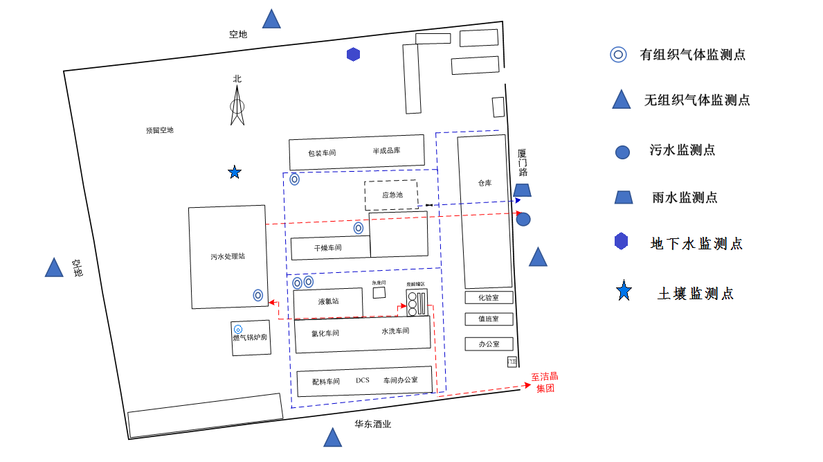 污水總排口一個(gè),位于廠區(qū)東側(cè)外墻外,大氣排放口共5個(gè),其中污水處理1個(gè),氯化2個(gè),干燥1個(gè),包裝1個(gè) |
