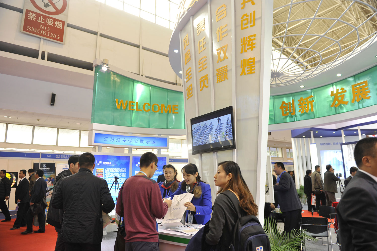 總公司在這次展會(huì)上首次參展亮相,采取多種方式來(lái)展示淮安保安品牌:一是認(rèn)真確定了展位面積和位置,以及新穎、獨(dú)特、大氣的展位設(shè)計(jì);二是制作了圖文并茂并有特色亮點(diǎn)的宣傳展示燈箱,推出跨國(guó)保安服務(wù)、一站式保安服務(wù)和自行研發(fā)的運(yùn)鈔車圖像傳輸系統(tǒng)等獨(dú)特實(shí)用的亮點(diǎn)項(xiàng)目;三是專業(yè)、標(biāo)準(zhǔn)、靚麗的禮儀接待服務(wù)。做到服務(wù)有形象,展示有內(nèi)容。四是在展會(huì)期間,我們分四批組織了公司人防、押運(yùn)等部門50余名骨干來(lái)京觀展,向同行學(xué)經(jīng)驗(yàn),向優(yōu)秀企業(yè)學(xué)管理。