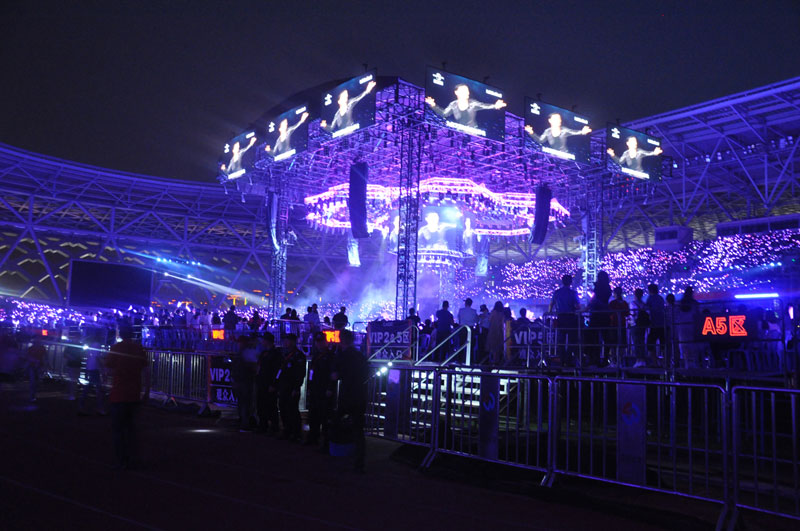 5月5日,“A CLASSIC TOUR學友·經(jīng)典世界演唱會”揚州站,以人防中心王錦春總監(jiān)為領導管理班子,積極與主辦方聯(lián)絡,在演唱會前一天,組織精干管理人員踏勘現(xiàn)場,提出合理化安保建議,精心組織崗位分配,各項前期準備工作有條不紊地開展。5日上午10時,第一批100名大型活動特勤安保隊伍進駐揚州體育公園,下午16時,100名專業(yè)安檢員和特勤隊員準時到達各預定崗位開展工作。在整場演唱會活動中,安檢崗位中查獲各類違禁品5000余件。因主辦方設定預檢票口位置較少,造成大量觀眾聚集,我們合理調集機動隊伍認真做好人員疏散工作,避免了事故隱患。