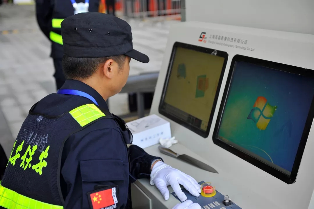 執(zhí)勤人員在安檢口對包裹進(jìn)行檢查
