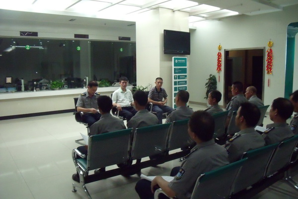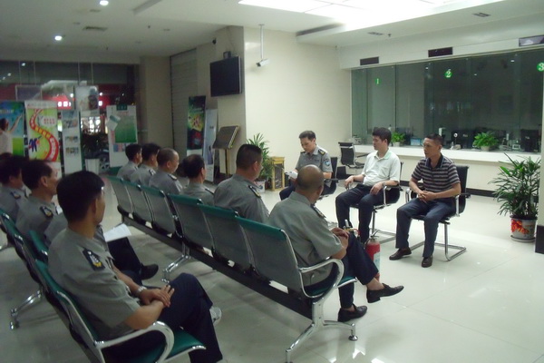 (上圖)為了組織好此次專項(xiàng)銀行突發(fā)事件應(yīng)急演練的消防安全演練,黃瑞明科長和林銘春中隊(duì)長以實(shí)例向保安員講解應(yīng)對犯罪嫌疑犯人在營業(yè)廳實(shí)施搶劫暴力侵害時,要以“平息事態(tài)、控制局面、防止擴(kuò)大散、減少損失”為主要原則,針對不同情況采取制止、保護(hù)、求援、疏散等方法,確保銀行營業(yè)場所的安全,并對消防安全“四個能力”建設(shè)、火災(zāi)基礎(chǔ)知識、高層建筑逃生自救、辦公樓常用消防設(shè)施的檢查、使用等多個方面進(jìn)行對保安員詳細(xì)講解培訓(xùn)。