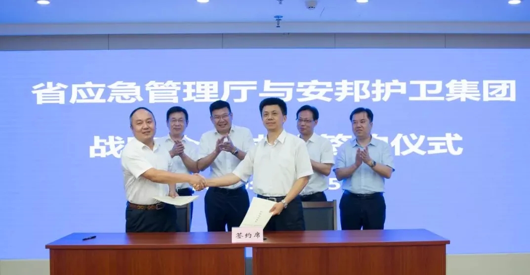 7月15日,浙江省應(yīng)急管理廳和浙江安邦護(hù)衛(wèi)集團(tuán)有限公司在浙江省行政中心舉行戰(zhàn)略合作簽約儀式。浙江省應(yīng)急管理廳黨委書記、廳長凌志峰,省國資委黨委委員、副主任劉盛輝,安邦護(hù)衛(wèi)集團(tuán)黨委書記、董事長吳高峻出席簽約儀式并致辭。